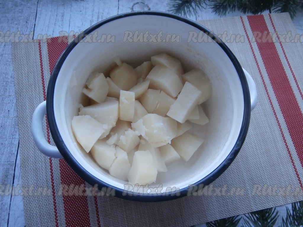 После того как вода закипит, добавить соль и, уменьшив огонь, варить минут 25-30 (картофель должен свариться до готовности, он будет легко прокалываться ножом), затем слить всю воду из кастрюли.