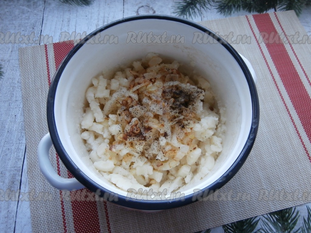 Варёный картофель растолочь. В получившееся пюре добавить жареный лук, поперчить, если нужно, досолить, перемешать, дать картофельной начинке для вареников остыть.