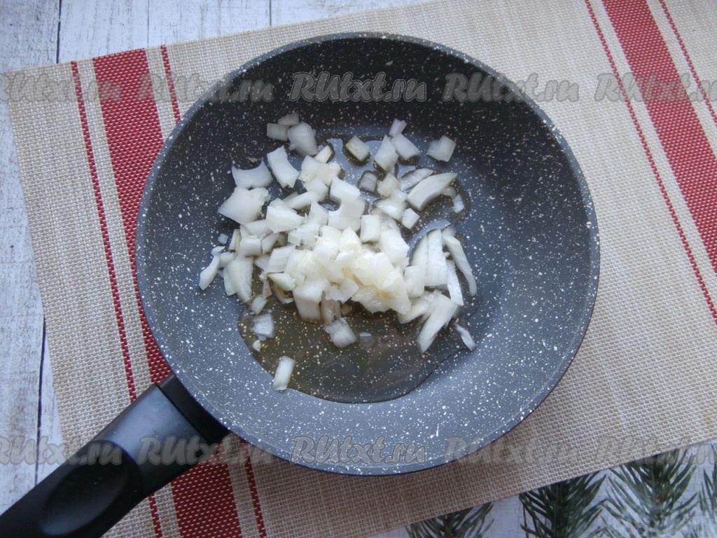 В сковороду налить растительное масло, сразу выложить луковицу, нарезанную на небольшие кусочки, и обжарить её до золотистости (на это потребуется 3-5 минут) на среднем огне, иногда помешивая.