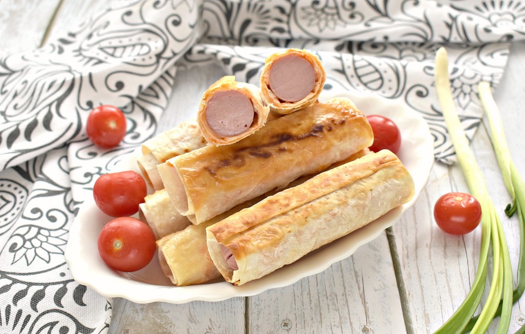 Если нужно быстро, вкусно и сытно перекусить, то предлагаю пожарить на сковороде сосиски с сыром в лаваше. Рецепт не представляет сложности, нужно только нарезать тонкий лаваш на прямоугольные заготовки, сформировать трубочки с начинкой из соуса, сыра и сосисок, а затем обжарить их на сковороде. Такая горячая закуска понравится и взрослым, и ребятам, к тому же она прекрасно утоляют голод, да и готовится за считанные минуты.