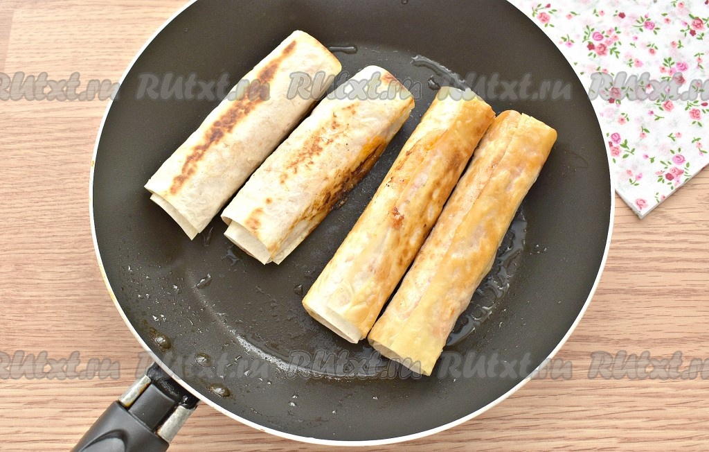 В сковороде разогреваем растительное масло. Помещаем на сковороду сосиски с сыром в лаваше и обжариваем их с каждой стороны до румяной корочки (примерно, по 1,5-2 минуты) с каждой стороны на среднем огне.