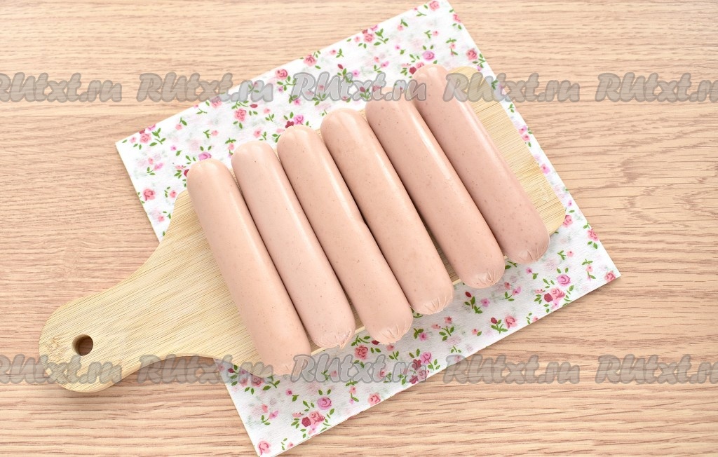 Очищаем сосиски от оболочки. У меня "Молочные" качественные сосиски небольшого размера.