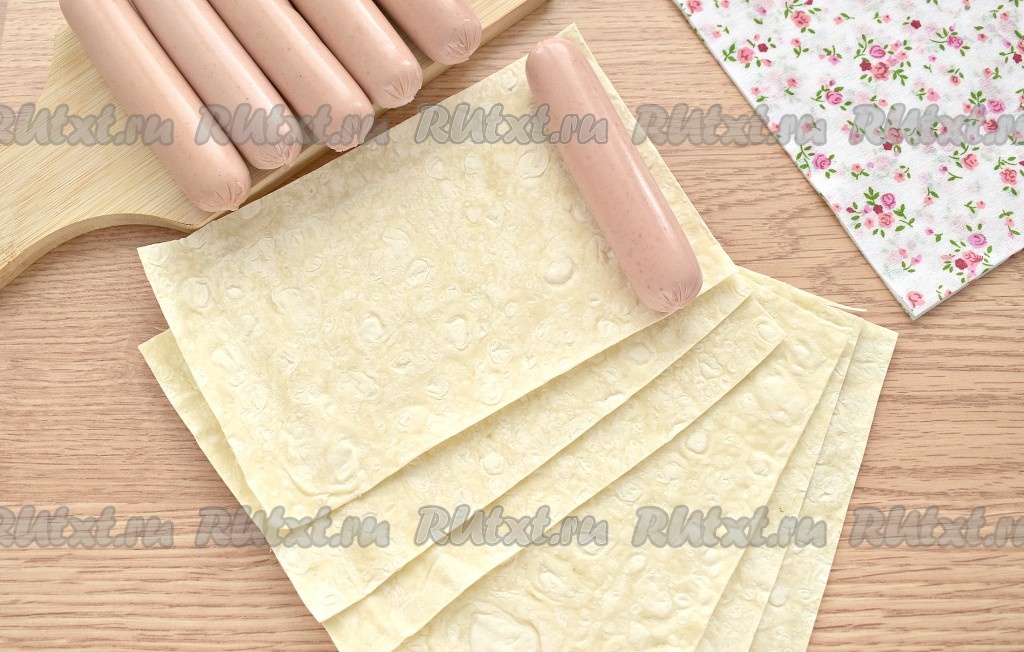 Тонкий лаваш разрезаем на прямоугольные заготовки, по ширине равные длине сосисок. Ориентируйтесь на свой используемый лаваш и размер сосисок, у меня получилось 6 заготовок.