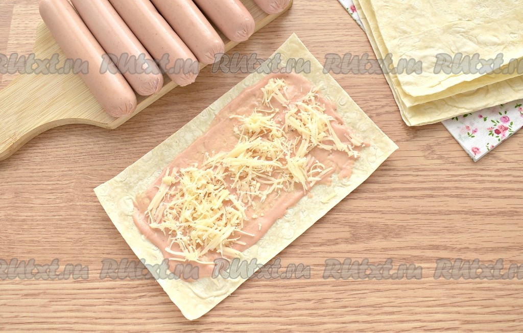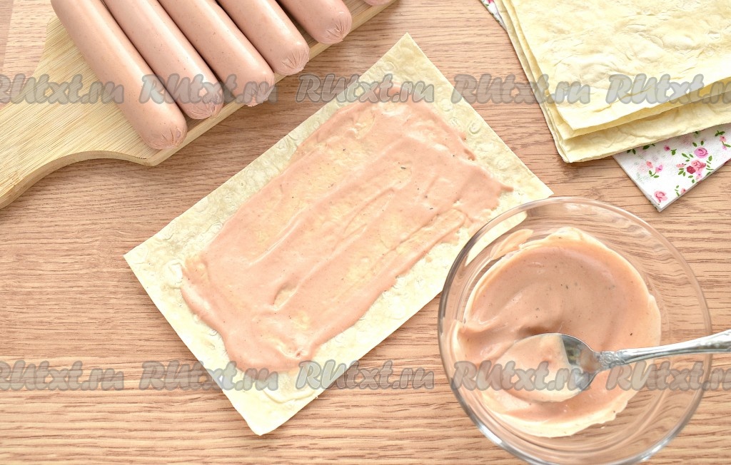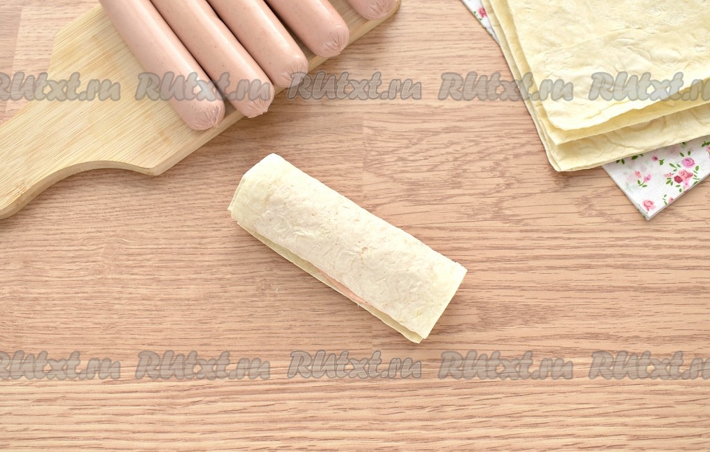 На каждую заготовку с краю кладём сосиску и заворачиваем её в лаваш. Также поступаем с оставшимися сосисками.
