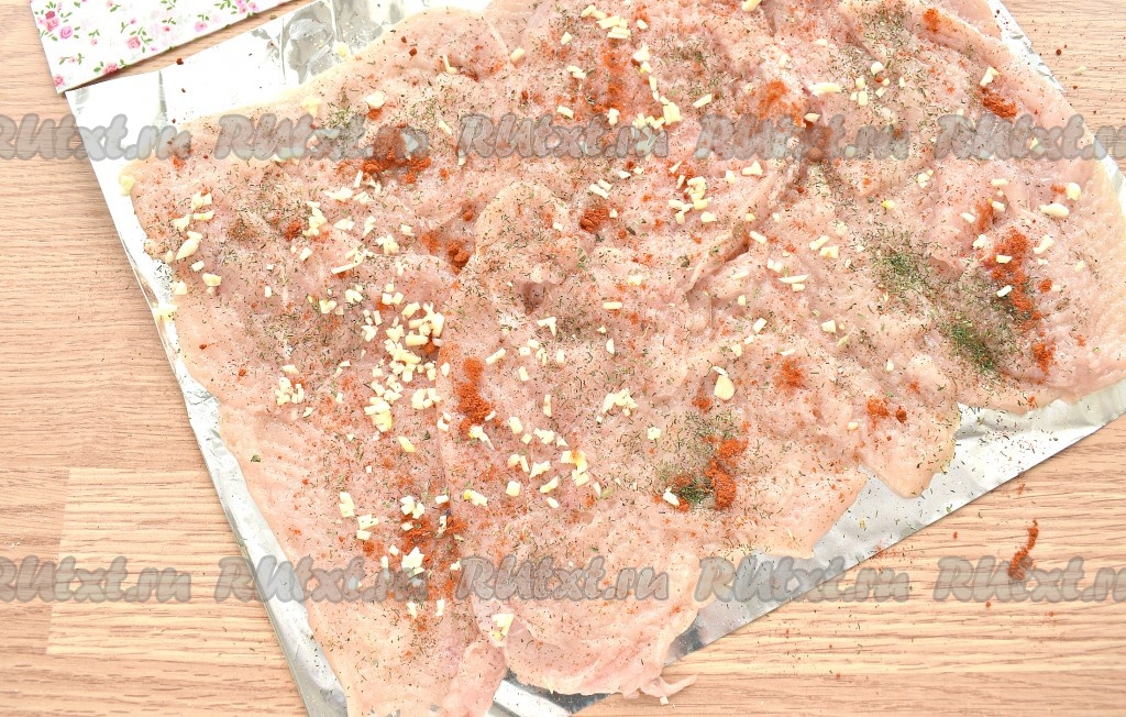 Заготовку для рулета солим по вкусу, посыпаем любимыми специями (в качестве специй я использовала чёрный молотый перец, 0,5 чайной ложки паприки, 0,5 чайной ложки сушёного укропа и 0,5 чайной ложки сушёного базилика). Равномерно распределяем по поверхности мяса нарезанный чеснок.