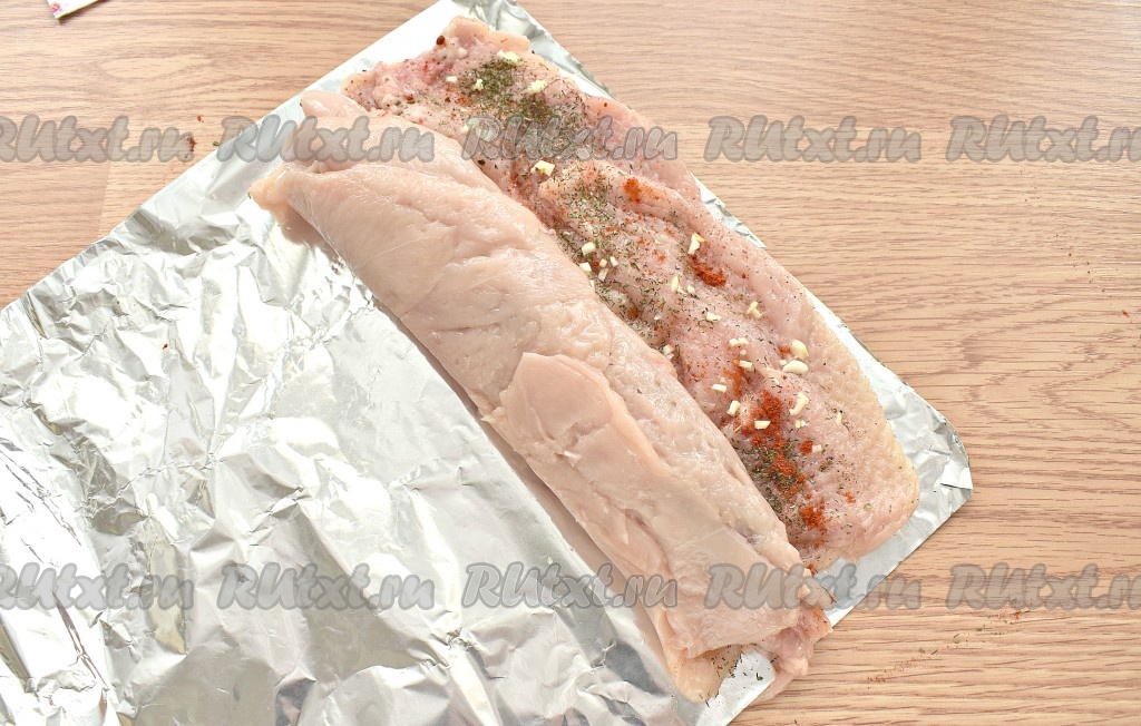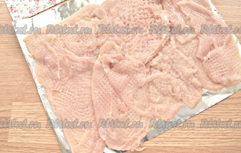 На столе расстилаем кусок фольги, сложенный вдвое. Распределяем на фольге отбитые пласты куриного филе немного внахлёст, формируя четырёхугольную заготовку. У меня получилась заготовка размером 25 сантиметров на 30 сантиметров.