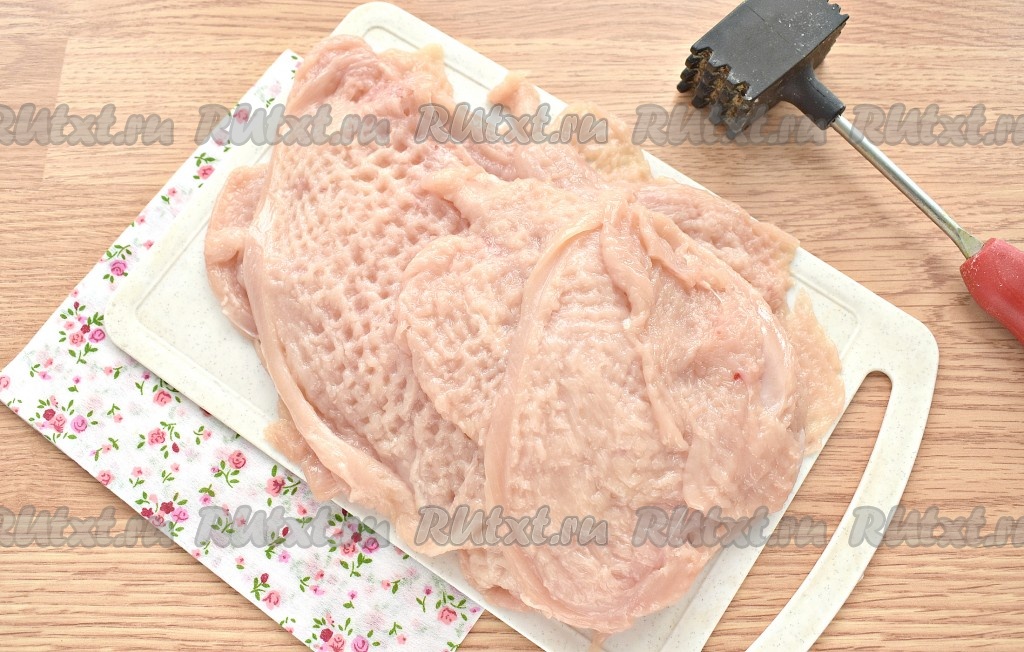 Теперь каждый пласт кладём на разделочную доску, накрываем мясо пищевой плёнкой (или одноразовым целлофановым пакетом) и отбиваем молоточком для мяса. Не переусердствуйте, пласты не должны порваться.