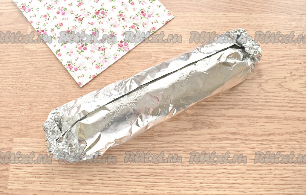 Помогая себе фольгой, начиная с более узкой стороны, сворачиваем пласты в плотный рулет.