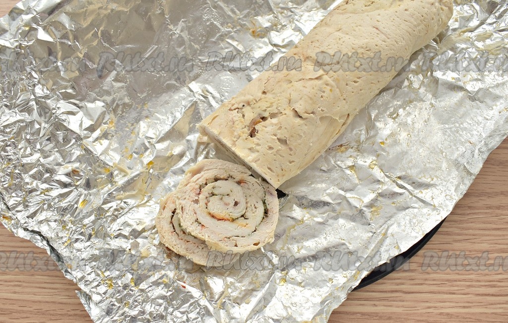 Затем достаём куриный рулет из духовки. Сразу запечённый рулет не разворачивайте, пусть он останется в фольге ещё минут на 20. Затем можно разворачивать.