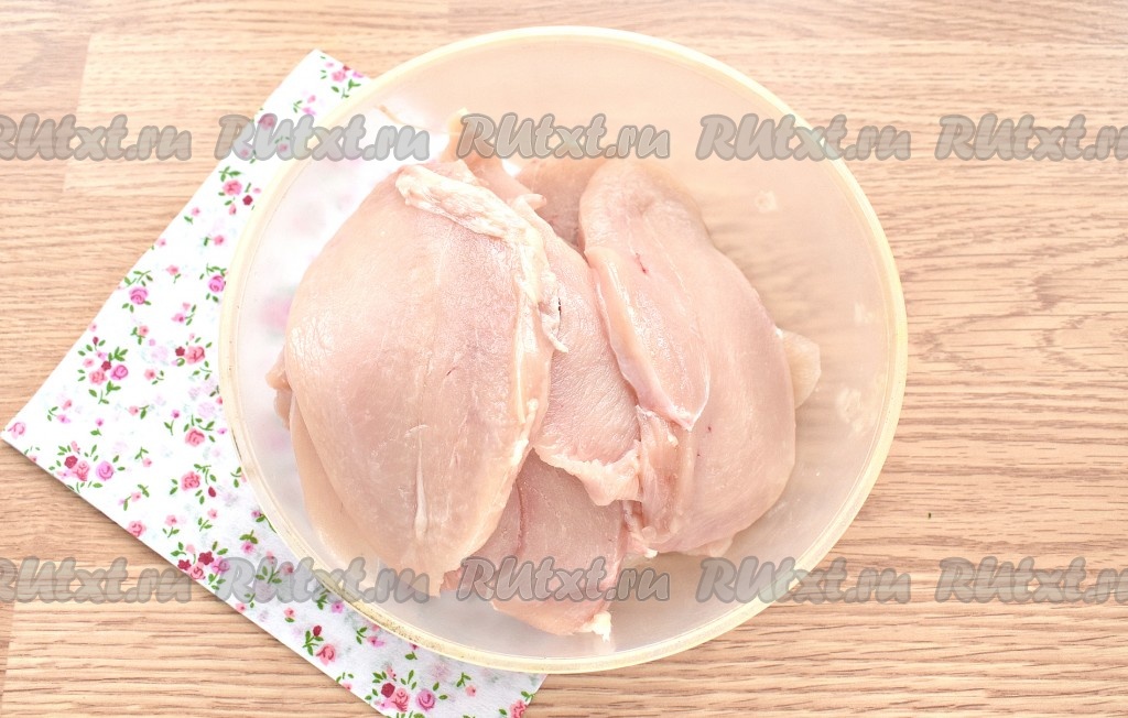 Куриное филе промываем водой, обсушиваем. Нарезаем филе вдоль на пласты толщиной примерно 1 сантиметр.