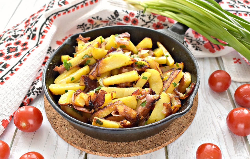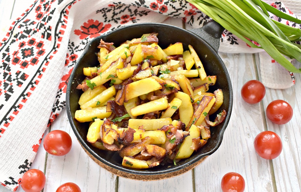 Жареная картошка является, пожалуй, самым простым, доступным и сытным блюдом, которое готовится на скорую руку. Чтобы разнообразить это любимое блюдо, предлагаю пожарить картошку вместе с сырокопчёным беконом и луком. Жареная картошечка получается аппетитной и очень вкусной, она отлично подойдёт для семейного обеда или ужина. Кушать её лучше сразу, с пылу с жару, так как остывшая или разогретая она немного проигрывает во вкусе. Поэтому такое блюдо следует готовить на один раз.