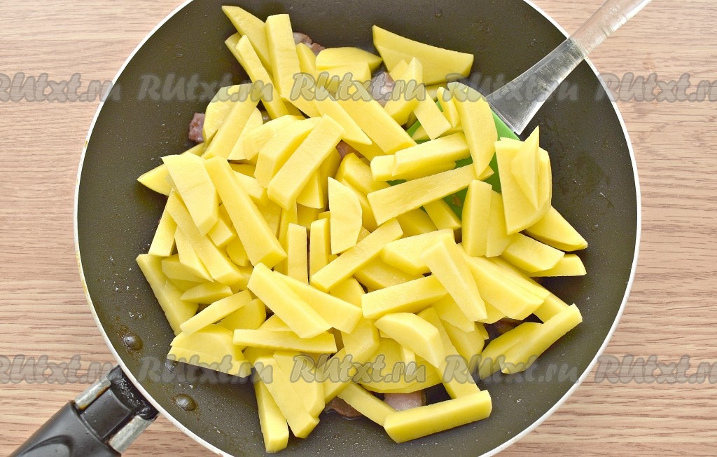 Затем к картошке добавляем очищенный и произвольно нарезанный лук, по вкусу солим и перчим. Продолжаем жарить ещё 5-6 минут, иногда перемешивая.