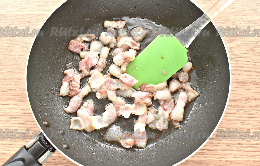 На сковороде разогреваем оливковое масло. Если такое масло отсутствует, подойдёт и подсолнечное масло. Выкладываем на сковороду кусочки бекона и обжариваем их, периодически перемешивая, 2-3 минуты на среднем огне.