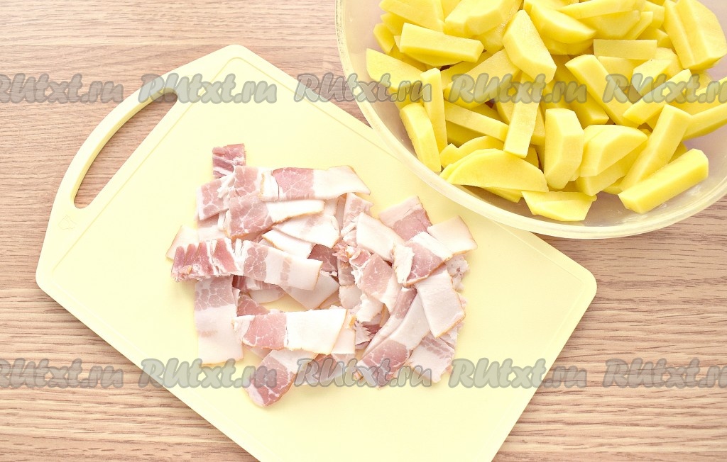 Пласты бекона нарезаем на небольшие кусочки. Картофель очищаем, ополаскиваем холодной водой и нарезаем так, как вам нравится. Я предпочитаю картофель для жарки нарезать крупной соломкой.