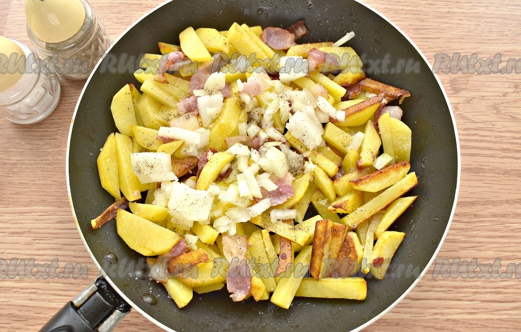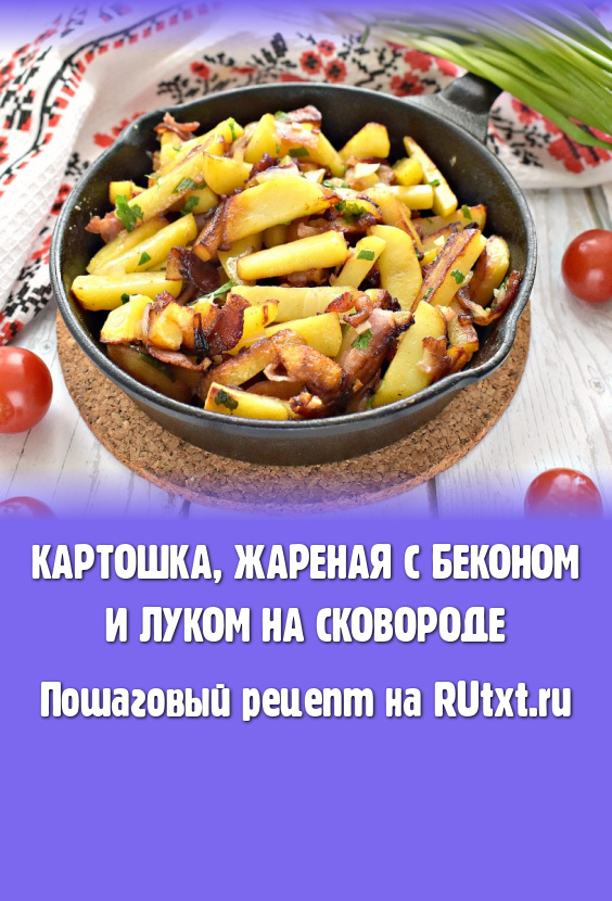 Картошка, жареная с луком и беконом на сковороде, готова. Картошечка получается сытной, аппетитной и очень вкусной!
