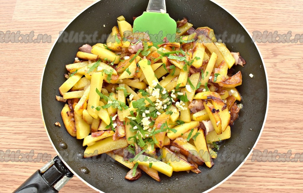 Добавляем нарезанную картошку, перемешиваем. Прибавляем нагрев плиты и жарим, примерно, 10 минут картошку. Часто перемешивать картофель с беконом не нужно, достаточно 2-3 раза за 10 минут.