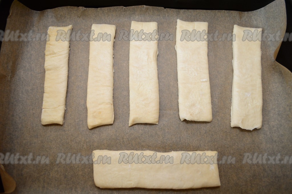 При помощи острого ножа разрезать тесто на прямоугольные полоски (язычки). Из одного пласта теста у меня вышло 6 язычков. Застелить противень бумагой для выпечки. Если вы сомневаетесь в качестве бумаги, то лучше дополнительно промазать поверхность бумаги растительным маслом. Я использую качественную бумагу для выпечки, в состав которой входит силикон. К такой силиконизированной бумаге ничего не пристаёт, поэтому я маслом её не смазываю. Выложить язычки из слоёного теста на бумагу.