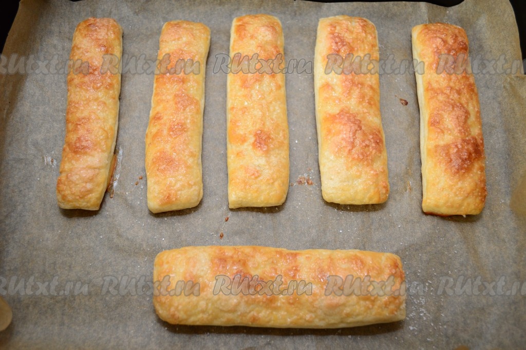Подготовленные язычки из слоёного теста ставим в разогретую духовку и выпекаем при температуре 180 градусов 15-20 минут (до золотистого цвета). Во время выпечки тесто хорошо поднимется.