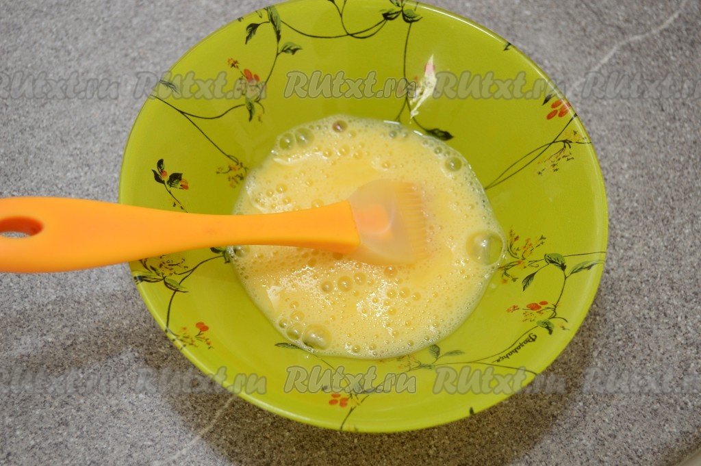 При помощи кулинарной кисти смазать верх язычков сырым яйцом. А потом посыпать слойки сверху сахаром. Я добавляю 3 чайные ложки сахара на 250 грамм слоёного дрожжевого теста, при этом язычки получаются сладкими, но в меру.