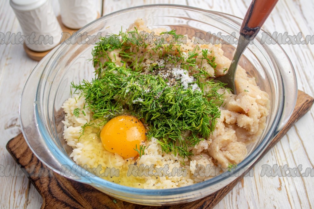 К фаршу с рисом добавьте сырое куриное яйцо, мелко нарезанный укроп, соль и чёрный молотый перец, перемешайте тщательно фарш для тефтелей.