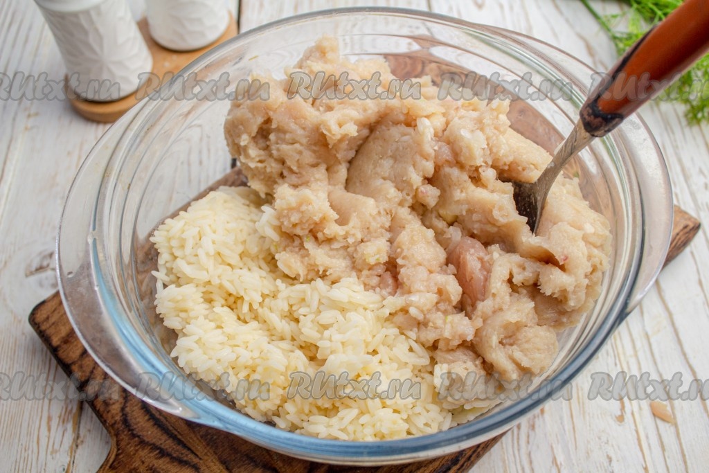 Приготовленный мясной фарш добавьте к заранее отваренному до полуготовности и остывшему рису.
