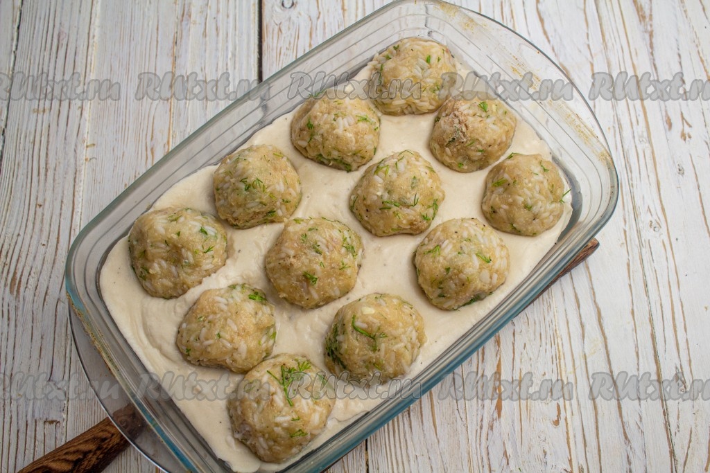 Из фарша сформируйте круглые куриные тефтели и выложите в сметанный соус.