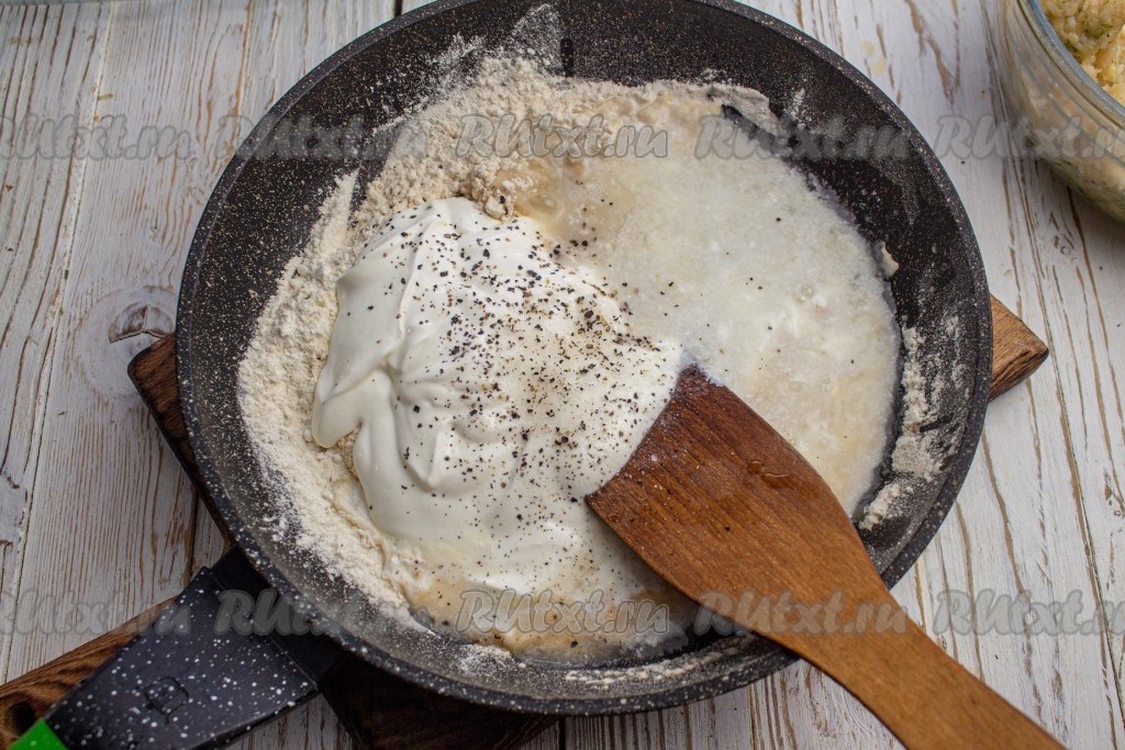 Добавьте сметану, соль и чёрный молотый перец по вкусу, влейте кипячёную воду.