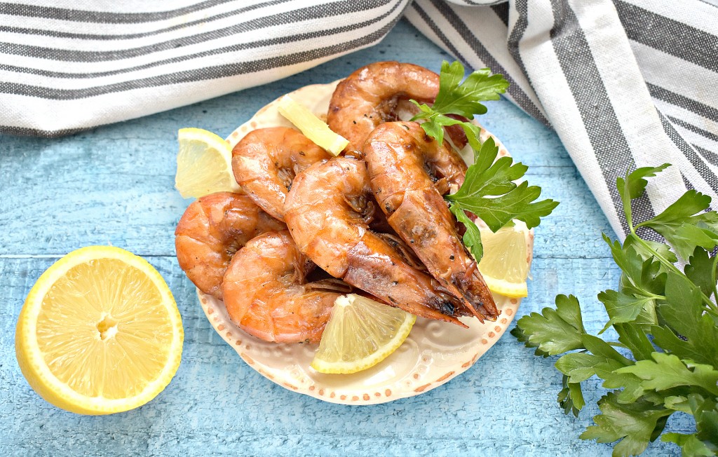 Аппетитные, вкусные, ароматные королевские креветки, томлёные в соевом соусе с чесноком, перекладываем со сковороды на тарелку, подаём их к столу и с удовольствием угощаемся.