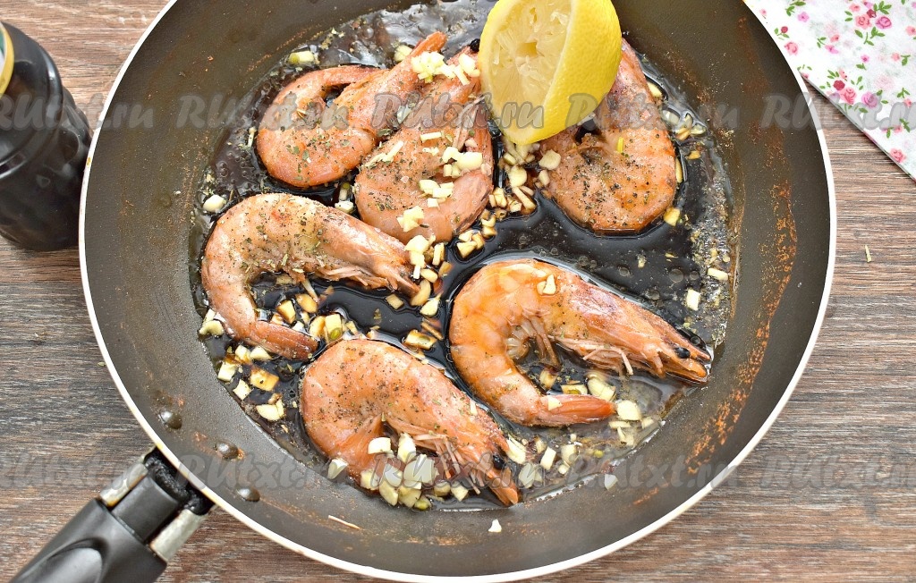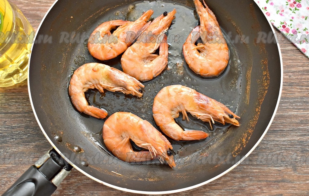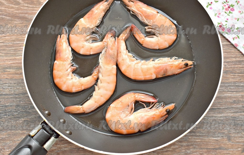 Креветки перекладываем в сковороду, вливаем тёплую прокипячённую воду и на сильном огне провариваем их в течение 2-3 минут после закипания, затем переворачиваем и продолжаем готовить ещё 2 минуты. Вода должна полностью испариться.