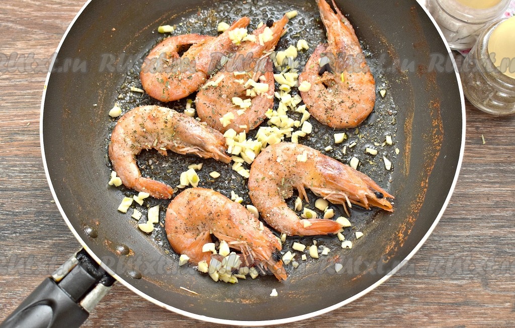 Сюда же добавляем нарезанный чеснок, по своему вкусу солим и перчим. Посыпаем креветки сушёными прованскими травами.