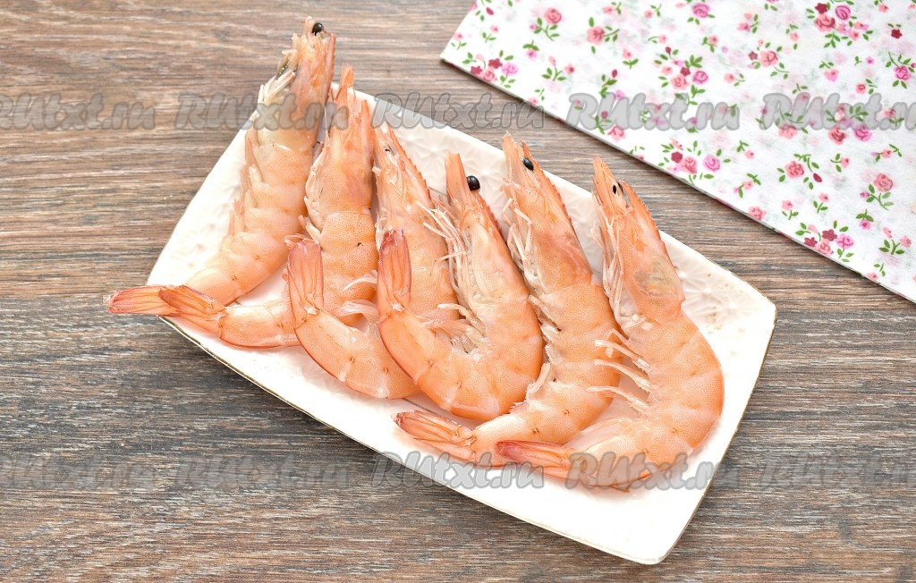 Я использовала замороженные королевские креветки в панцире. Их нужно заранее достать из морозилки, чтобы они разморозились при комнатной температуре. Размороженные креветки переложить в дуршлаг, обдать прохладной водой, оставить на несколько минут, чтобы с морепродуктов слилась лишняя вода. А затем промокнуть креветки бумажными полотенцами.