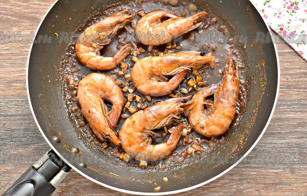 Томим королевские креветки в соевом соусе, лимонном соке с чесноком 3-4 минуты на среднем огне без крышки, в течение этого времени 1-2 раза креветки переворачиваем.