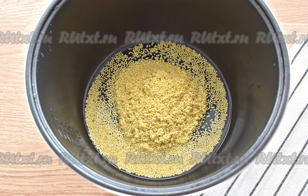 Промытую подготовленную пшённую крупу перекладываем в чашу мультиварки.