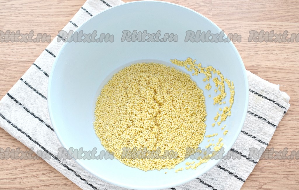 Пшено тщательно промываем под проточной водой. Затем крупу заливаем кипящей водой и оставляем в кипятке на 5 минут - такой приём избавит готовую кашу от горечи. Затем кипяток с крупы сливаем и снова промываем пшено под проточной водой.