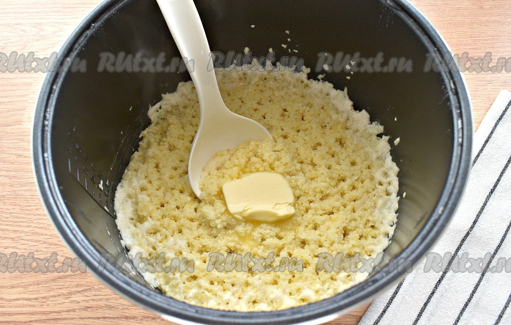 Готовим молочную пшённую кашу до звукового сигнала, затем открываем крышку мультиварки. В кашу добавляем кусочек качественного сливочного масла, хорошо перемешиваем. Мультиварку снова закрываем крышкой и даём каше настояться минут 10-15.