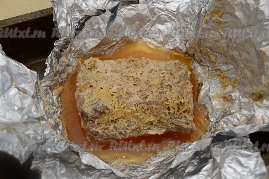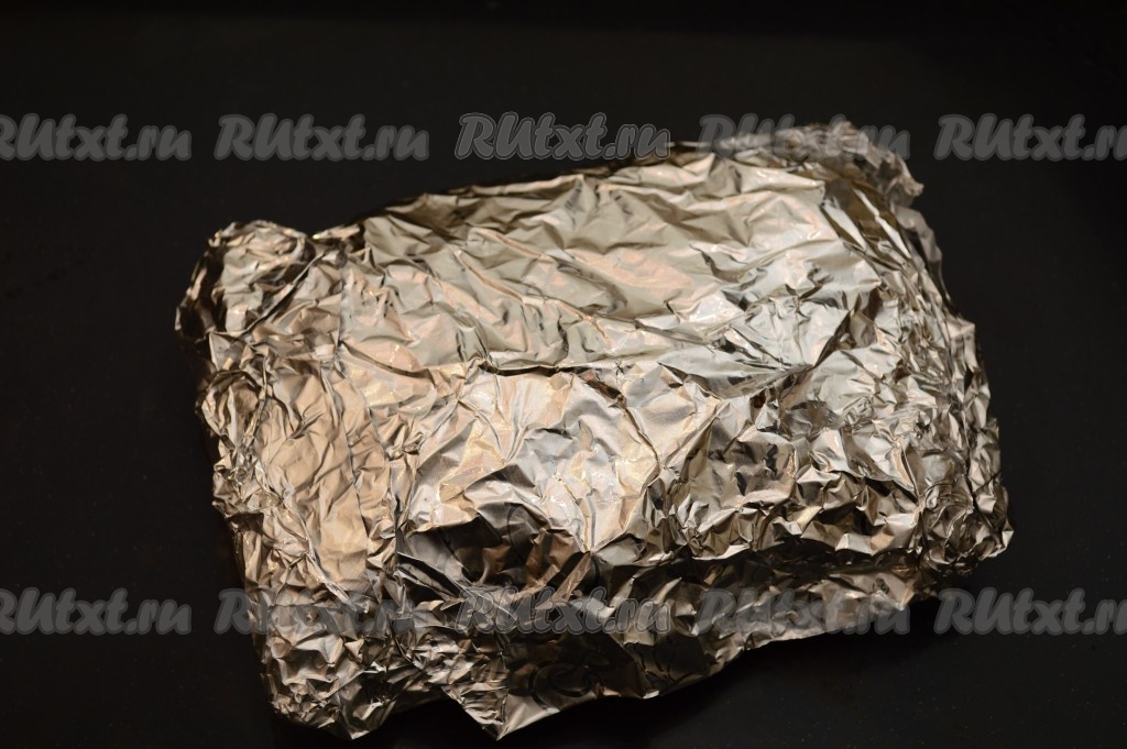 Затем заворачиваем свинину в два слоя фольги, перекладываем в форму, удобную для запекания (или на противень), и отправляем в духовку, разогретую до 190 градусов, на 2 часа.