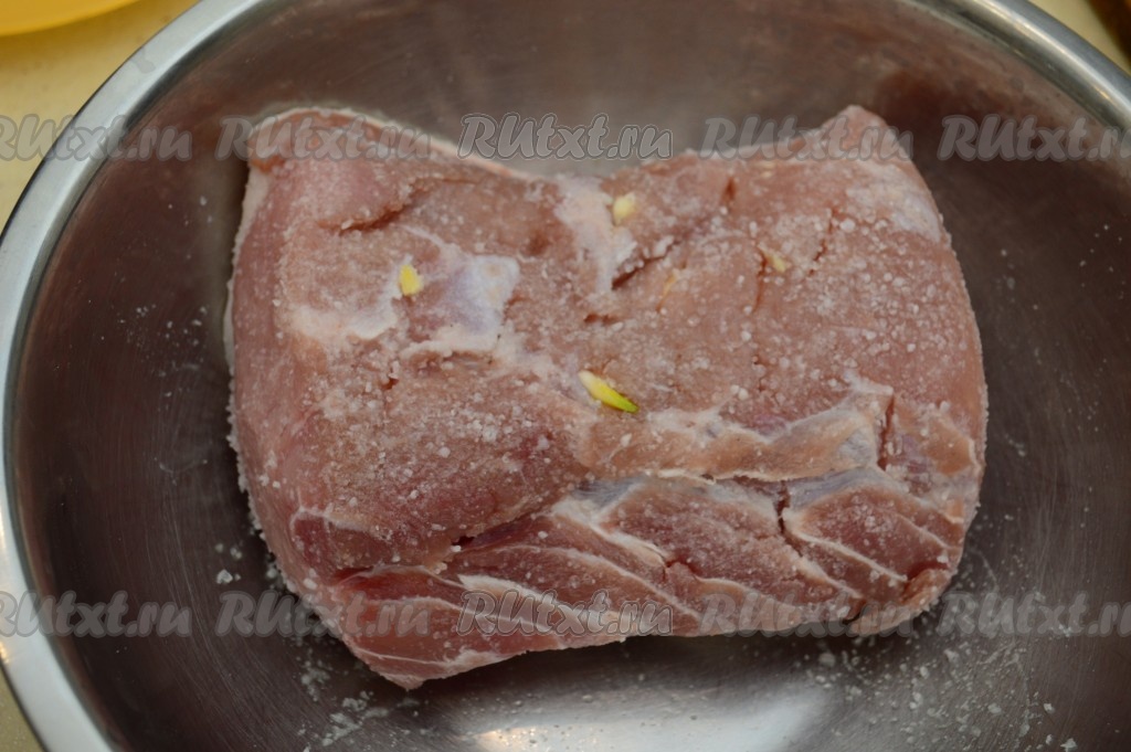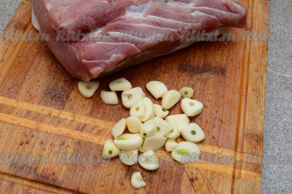 При помощи острого ножа сделать надрезы в мясе. В каждый надрез поместить по дольке чеснока. Надрезов должны быть достаточно много. Такие надрезы будут ещё способствовать и тому, чтобы мясо в дальнейшем быстрее и равномернее просолилось.