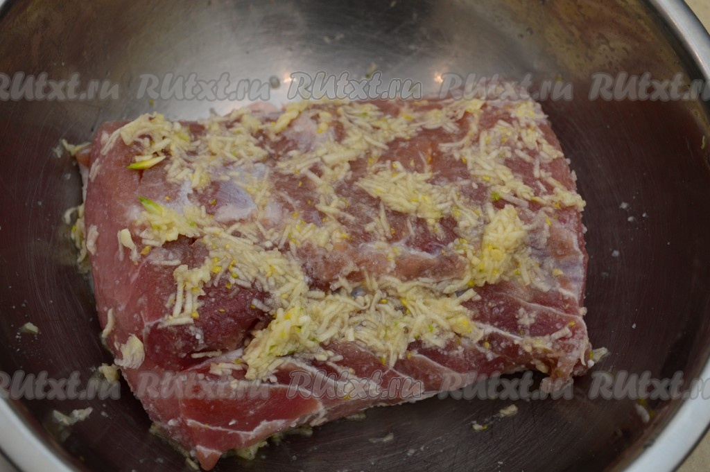 Вторую головку чеснока разбираем на зубчики, которые пропускаем через пресс. Получившейся чесночной массой обмазываем кусок свиной корейки со всех сторон. Кладём мясо в миску и отправляем на 1-2 часа просолиться в холодильник, накрыв крышкой.