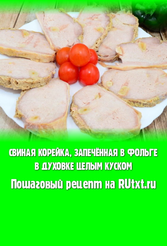 Свиную корейку, запечённую в фольге в духовке целым куском, можно сразу нарезать на кусочки и в горячем виде подать к столу, дополнив гарниром. Но такое мясо очень хорошо подходит в качестве холодной мясной закуски. К праздничному столу я предпочитаю подавать такую свинину полностью остывшей, нарезаю её на кусочки, выкладываю на плоскую тарелку, украшаю зеленью или овощами. Свинина получается мягкой, вкусной, ароматной и не сухой.