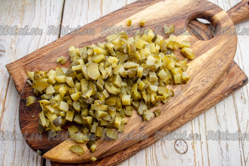 Солёные огурцы нарежьте мелко. Если в огурцах много влаги, то отожмите её.