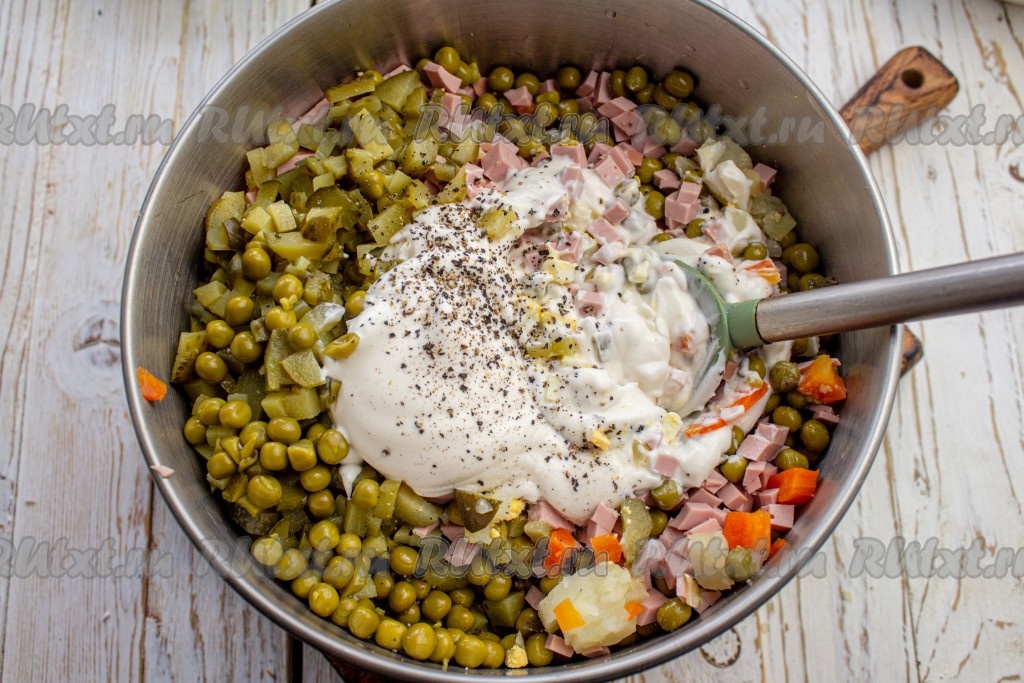 Огурчики выложите к остальным нарезанным ингредиентам, добавьте консервированный горошек без жидкости, соль, чёрный молотый перец и майонез. Хорошо перемешайте салат.
