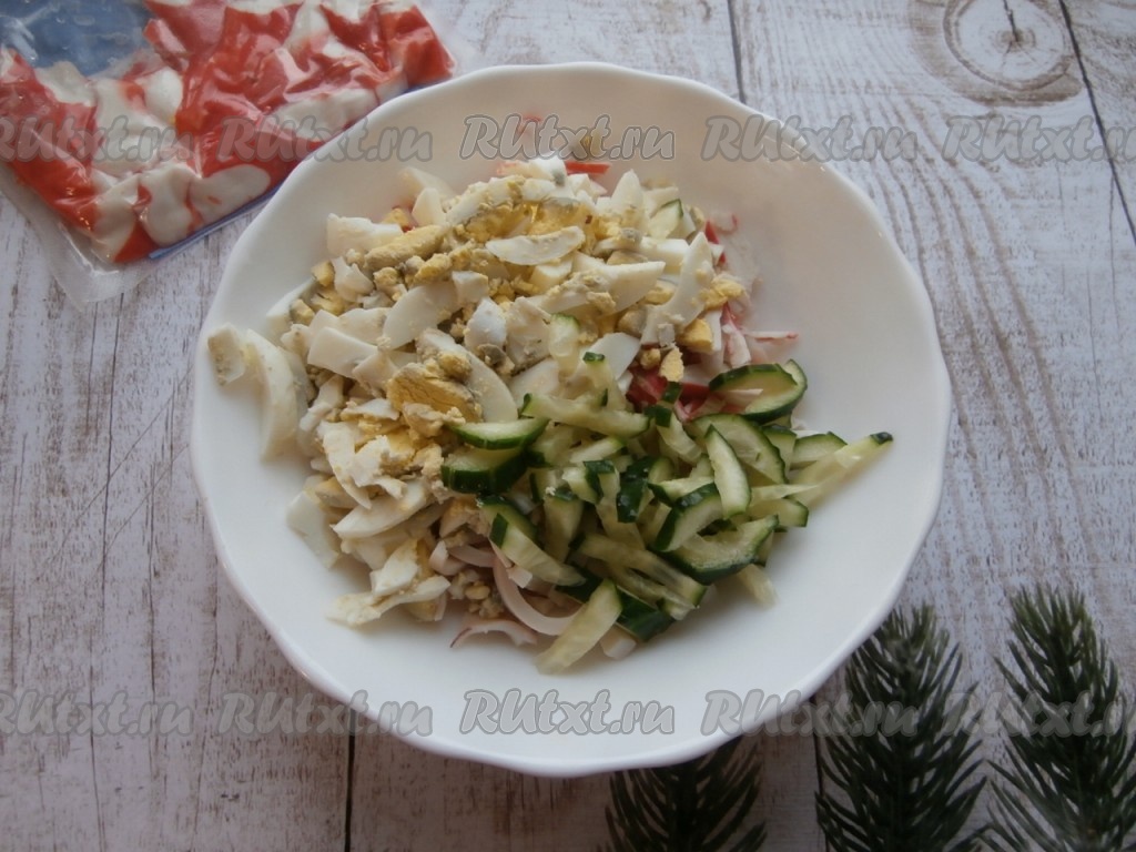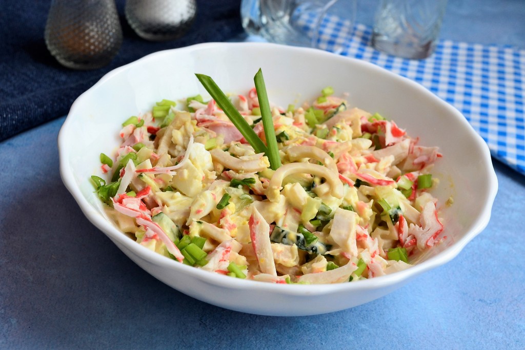 Очень вкусный и сытный салат из крабового мяса и кальмаров достаточно просто приготовить к праздничному столу. Главное здесь - не переварить кальмаров, чтобы они не были жёсткими. В этом блюде все ингредиенты отлично сочетаются, создавая гармонию вкусов. Обязательно попробуйте!