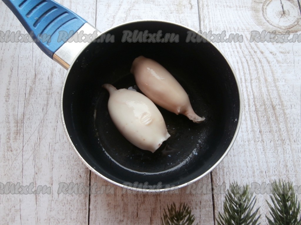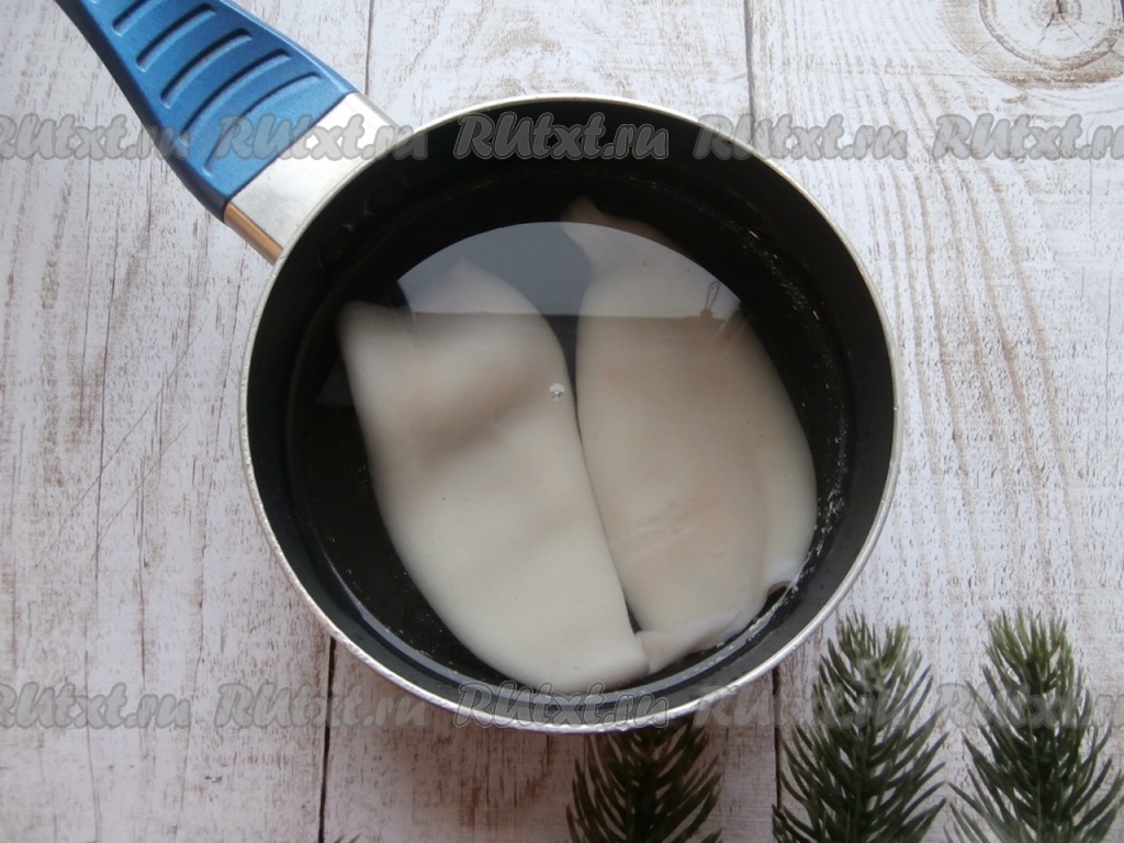 Если кальмары замороженные, разморозьте их при комнатной температуре. У меня были очищенные тушки кальмаров, мне их чистить не пришлось. Если у вас кальмары не очищенные, то их следует очистить от тёмной плёночки, покрывающей их поверхность, удалить хорду, находящуюся внутри тушек. Подготовленных кальмаров поместить в кастрюльку, залить холодной водой.