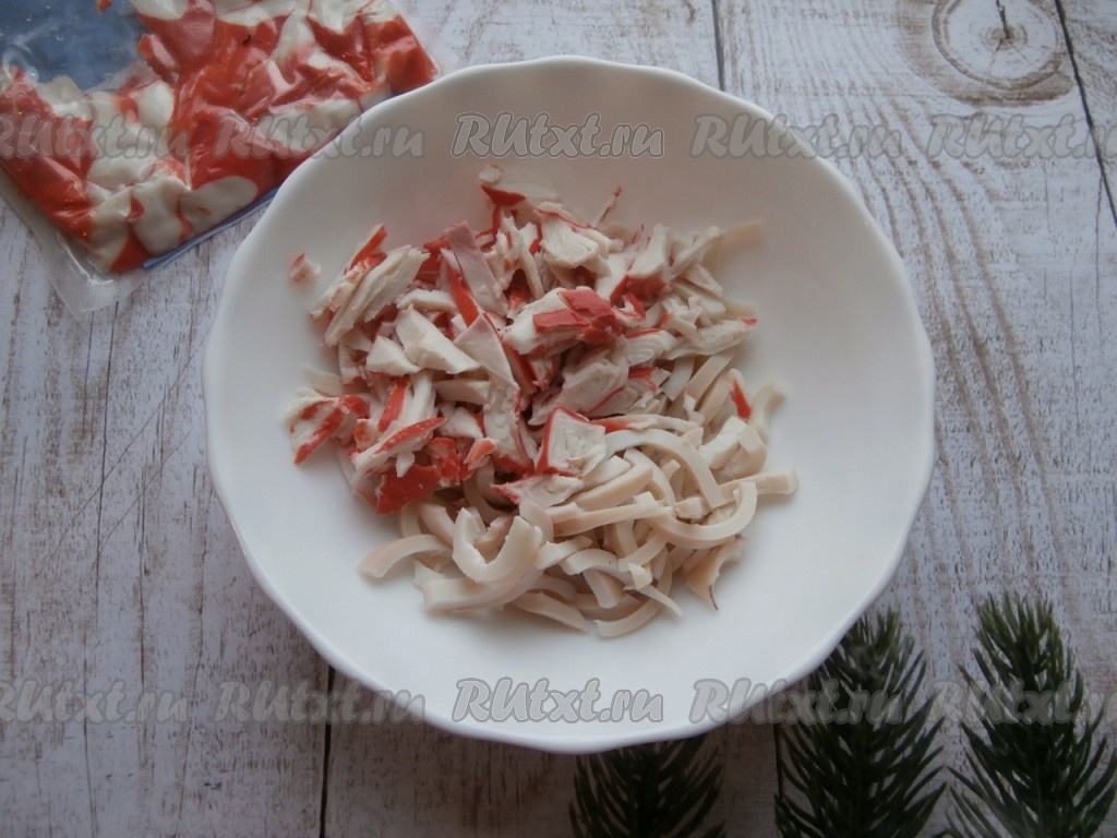 Нарезать кальмаров тонкой соломкой, крабовое мясо нарезать небольшими кусочками. Соединить крабовое мясо и кальмаров в глубокой миске.
