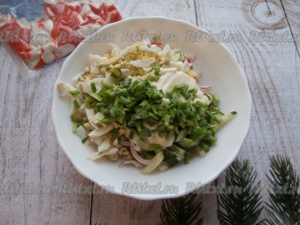 Добавить измельчённый зелёный лук, соль и майонез по вкусу, хорошо перемешать.