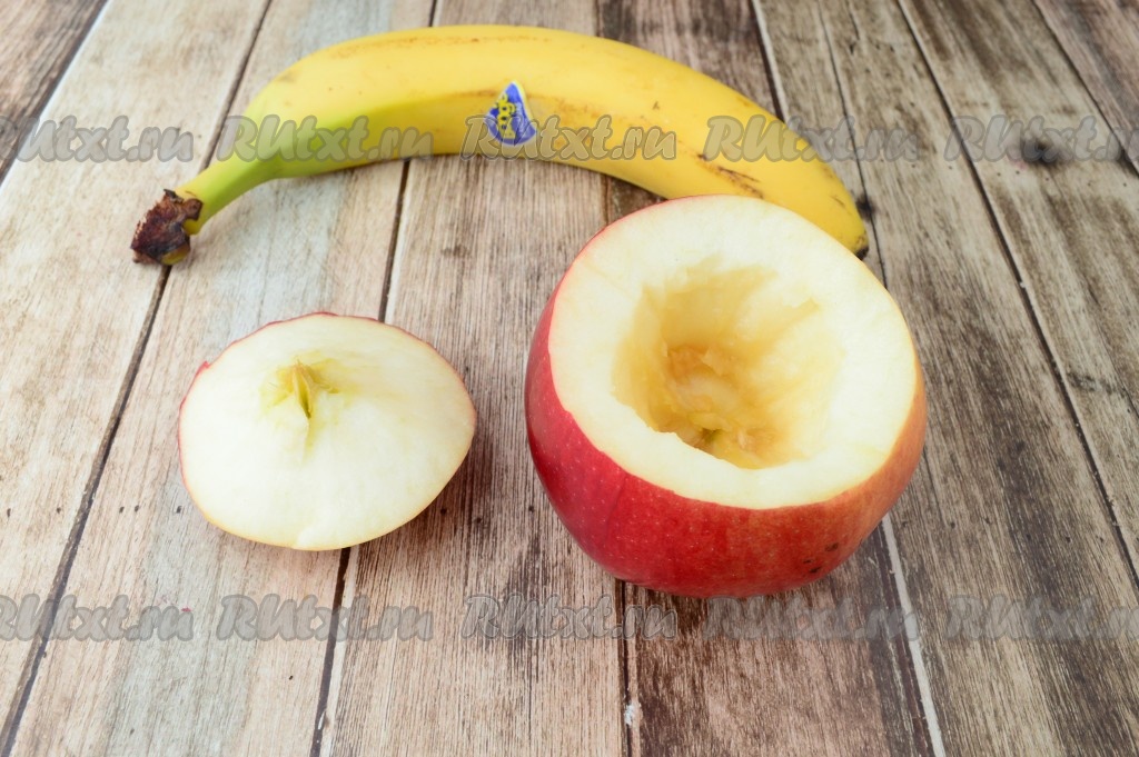 Банан очистить и нарезать на небольшие кусочки. Если у вас не сладкие яблоки или не спелый банан, то можно нарезанный банан смешать с сахаром. Я сахар не добавляла, так как сладости в фруктах было достаточно.