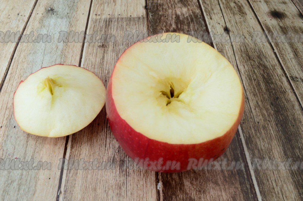 Затем острым ножом (или с помощью чайной ложки) удалить семенную коробочку, не прорезая яблоко насквозь. Получится "чашечка".