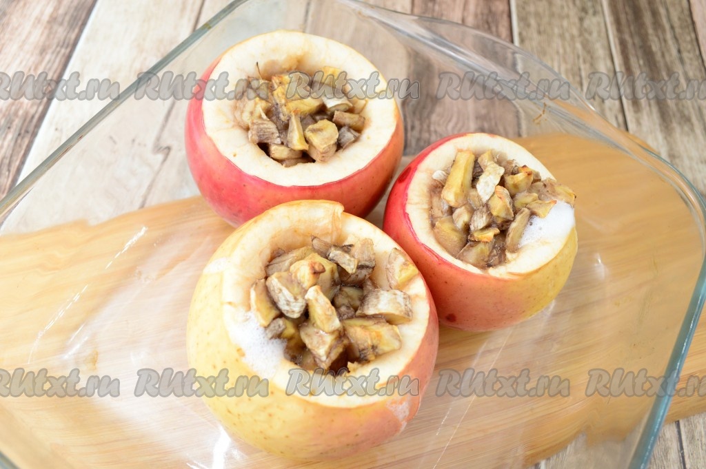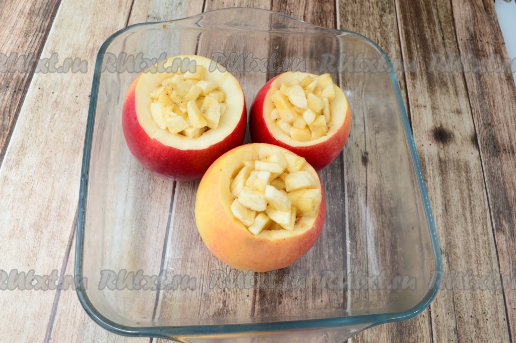 Выложить подготовленные яблоки в форму для запекания. Внутрь каждого яблочка вложить кусочки банана.