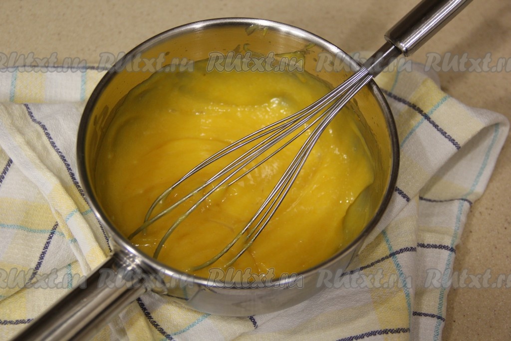 Как только масса закипит, убавить огонь до минимума, проварить крем, помешивая, одну минуту и снять с огня. Крем загустеет.