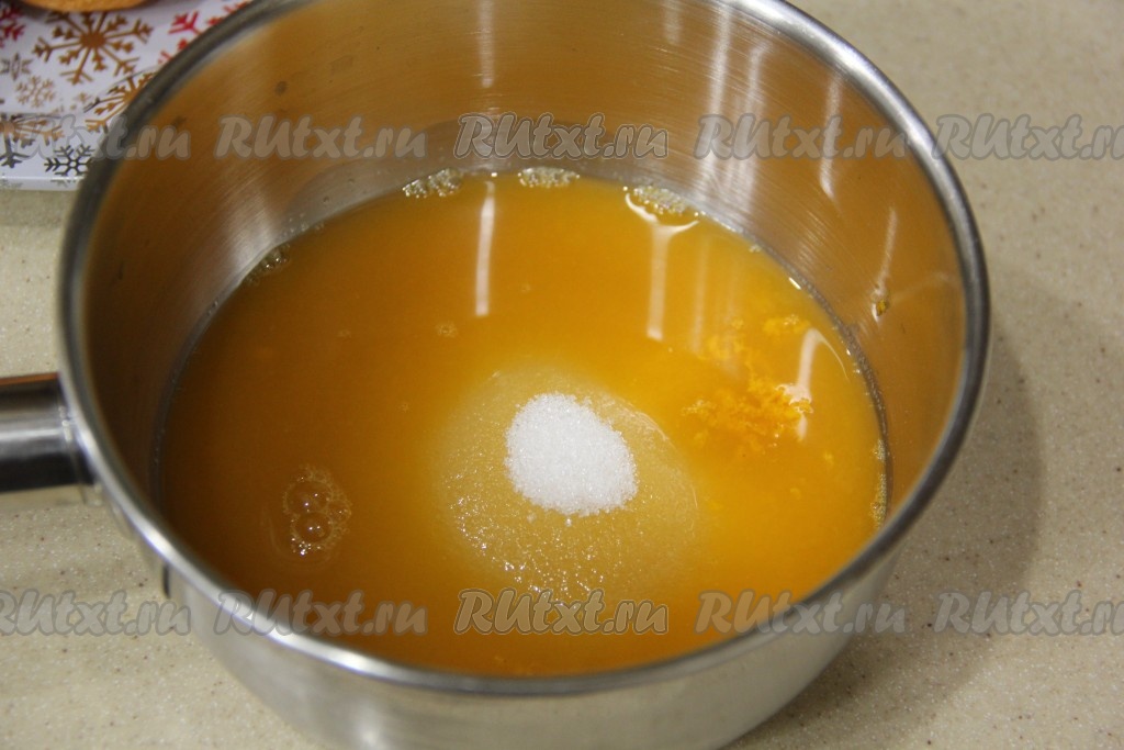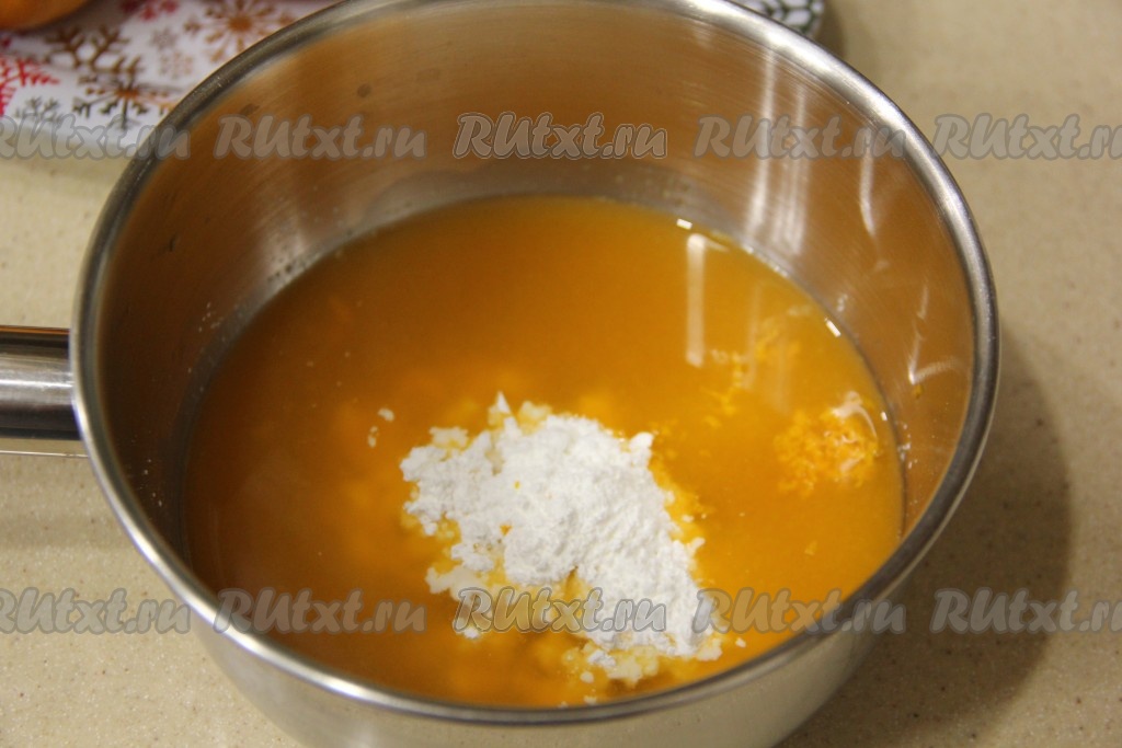 С части мандаринов снять цедру, предварительно хорошо промыв эти плоды. Для курда потребуется, примерно, 1 чайная ложка цедры. Мандарины очистить от кожуры и выдавить из них сок. Сок процедить. В сотейнике (или небольшой кастрюльке) соединить цедру и 110 мл свежевыжатого мандаринового сока.